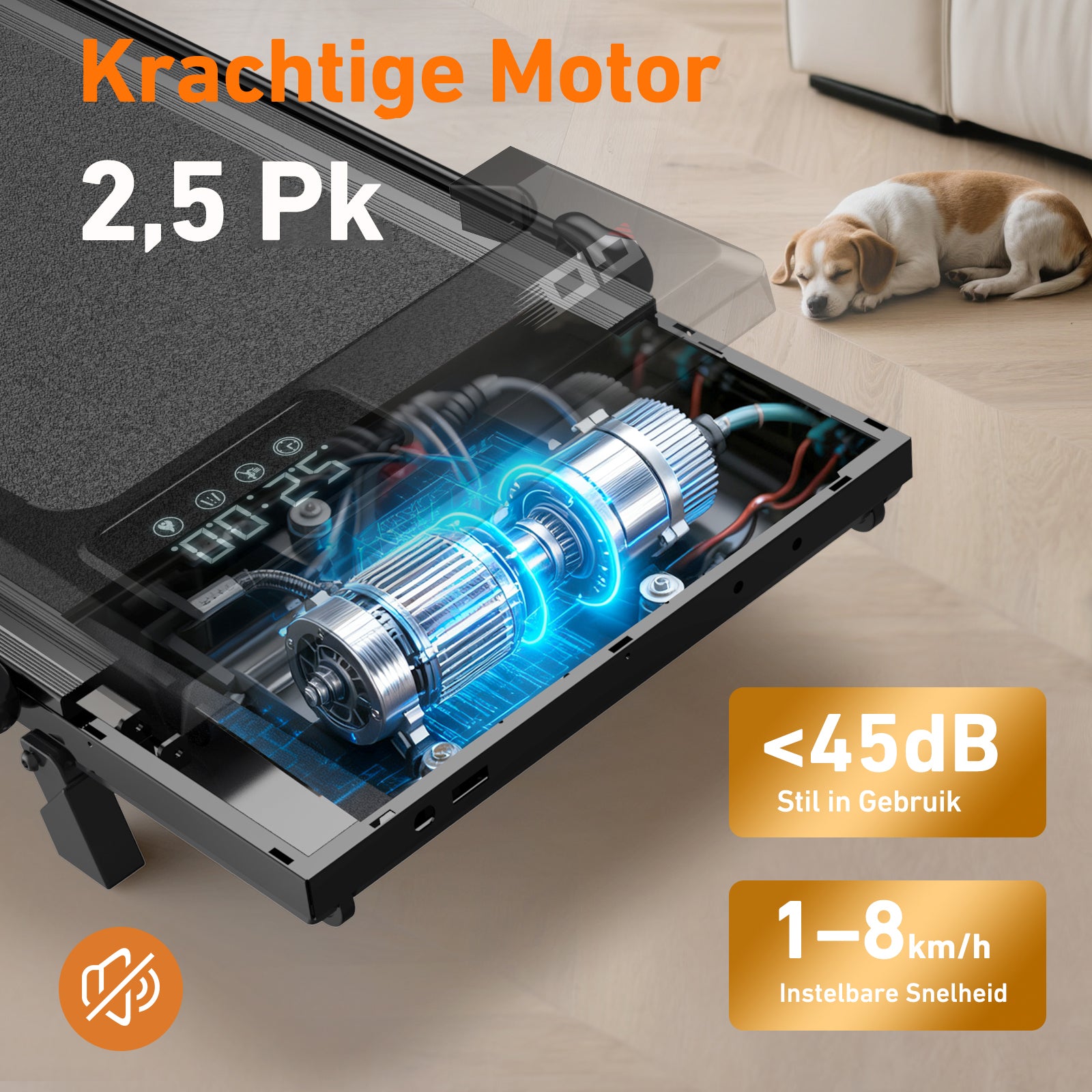 De hoogwaardige motor werkt stabiel en stil (<45 dB). 2,5 pk-motor, schokabsorptie, LED-display, compact ontwerp, voor thuis en op kantoor. Of u nu wandelt of licht jogt, met een snelheidsbereik van 1-8 km/h maakt deze loopband van alledaagse beweging een uitdagendere en lonende workout.